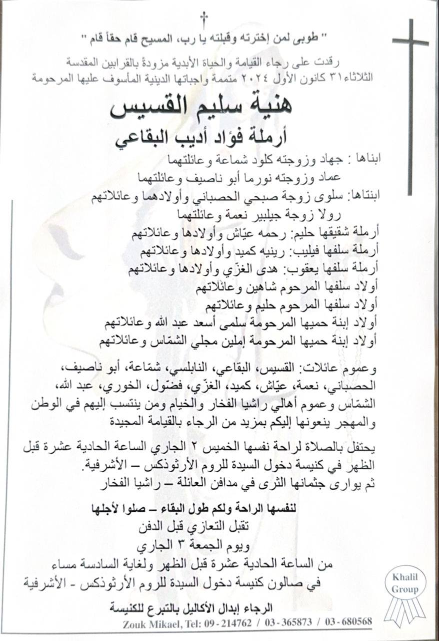 يُوارى جثمانها الطاهر في 2 ك2 2025 في مدافن العائلة في راشيا الفخار