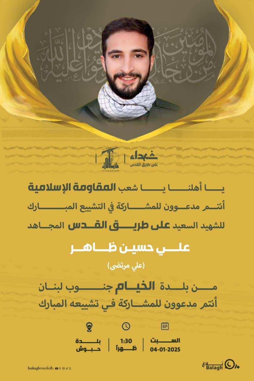 إنتقل إلى رحمته تعالى المأسوف على شبابه الشهيد علي حسين ضاهر