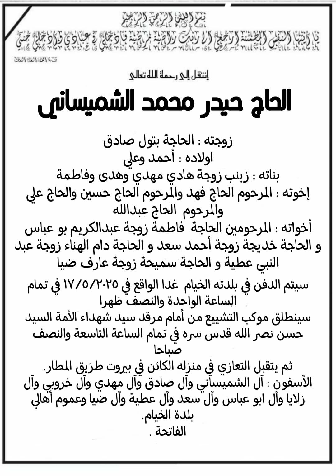 يوارى جثمانه الطاهر الثرى الساعة الواحدة والنصف ظهر ايوم السبت 17 أيار 2025 في جبّانة بلدته الخيام