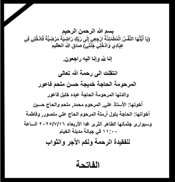 إنتقلت إلى رحمته تعالى الحاجّة خديجة حسن ملحم فاعور