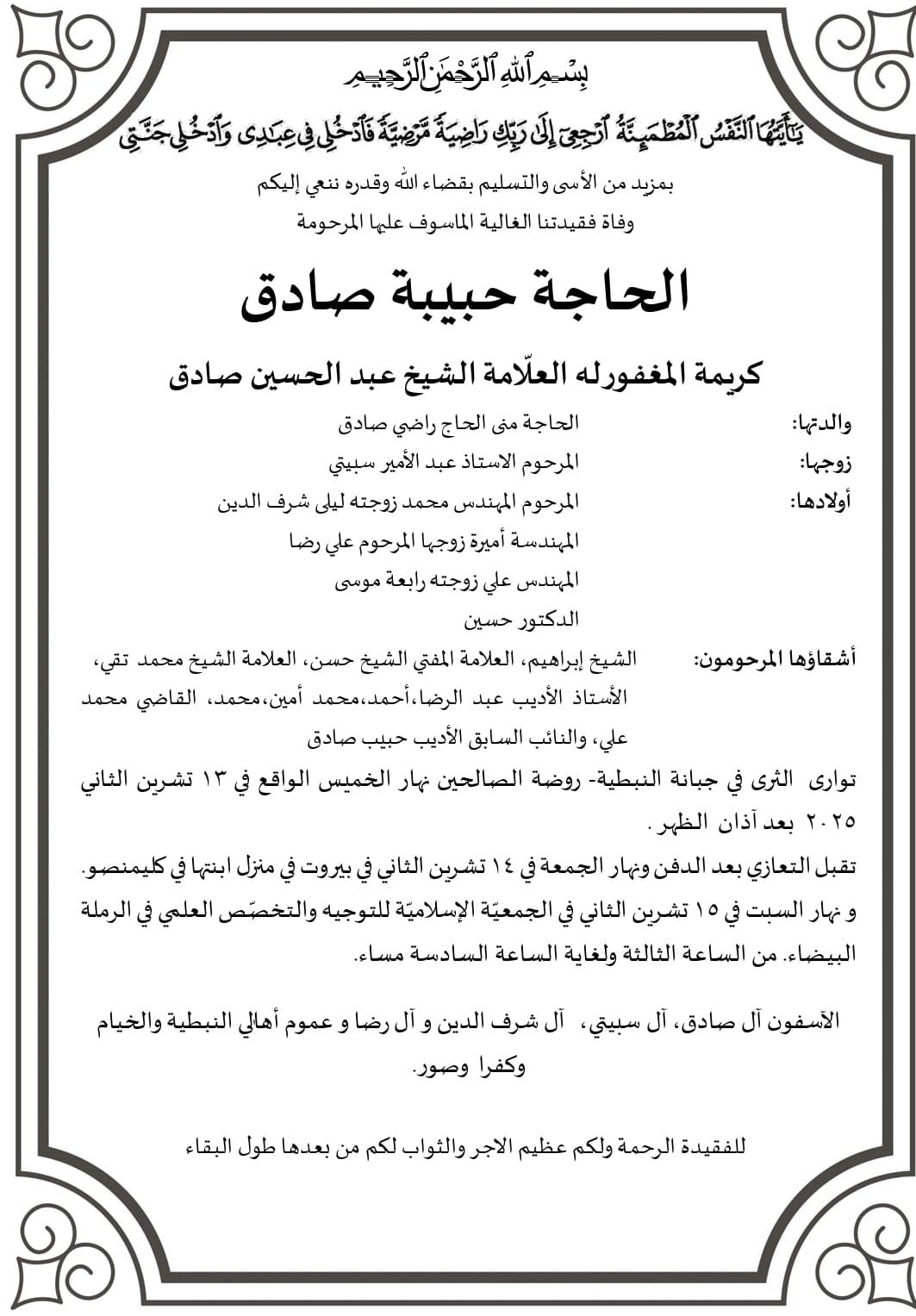 إنتقلت إلى رحمته تعالى الحاجّة حبيبة الشيخ عبد الحسين صادق (أم محمد سبيتي)