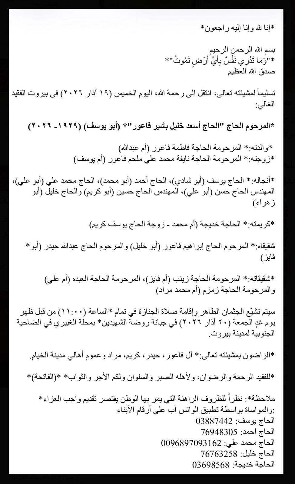 ملاحظة: نظراً للظروف الراهنة التي يمر بها الوطن يقتصر تقديم واجب العزاء والمواساة بواسطة تطبيق الواتس آب على أرقام الأبناء: