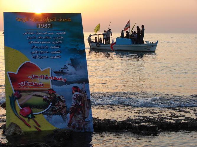 كما زرعت رايات النصر وانتشرت القوارب التي علتها الأعلام اللبنانية وأعلام حزب الله و وزعت الورود الحمراء على سطح المياه التي شهدت على بطولة واستبسال المقاومين، كما نصبت جدارية على سطح مياه البحر كتب عليها أسماء الشهداء الستة وعبارة (شهادة البحر شهادتان) كما خطت فتاة رسالة لهؤلاء الأبطال عبَّرت فيها عن إفتخار وعزة لما قاموا من عمل بطولي ووضعتها في زجاجة ورمتها إلى البحر.