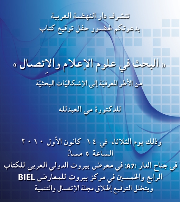 ستقوم الدكتورة مي كامل العبدالله بتوقيع كتابها الجديد "البحث في علوم الاعلام والاتصال" يوم الثلاثاء (14/12/2010) في جناح دار النهضة العربية خلال فعاليات معرض بيروت الدولي العربي للكتاب في مركز بيروت للمعارض (BIAL)، كما ويتخلل حفل التوقيع اطلاق مجلة الاتصال والتنمية.
