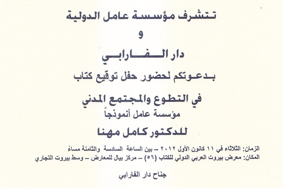 دعت مؤسسة عامل الدولية ودار الفارابي إلى المشاركة في حفل توقيع كتاب