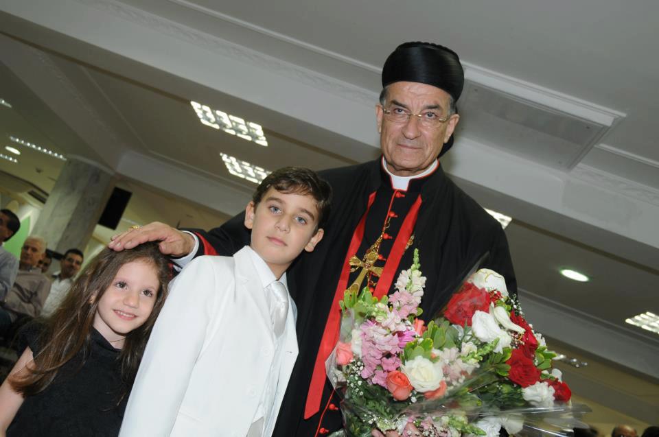 البطريرك الراعي حاملاً باقة الورد التي قدمها له الشاب الصغير طارق خليل عياش من الخيام