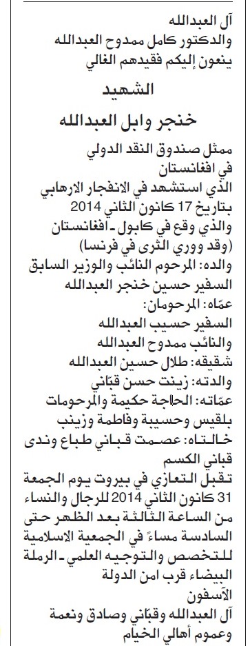 الخيام تفقد إبنها الدكتور وابل عبدالله في التفجير الإرهابي في أفغانستان