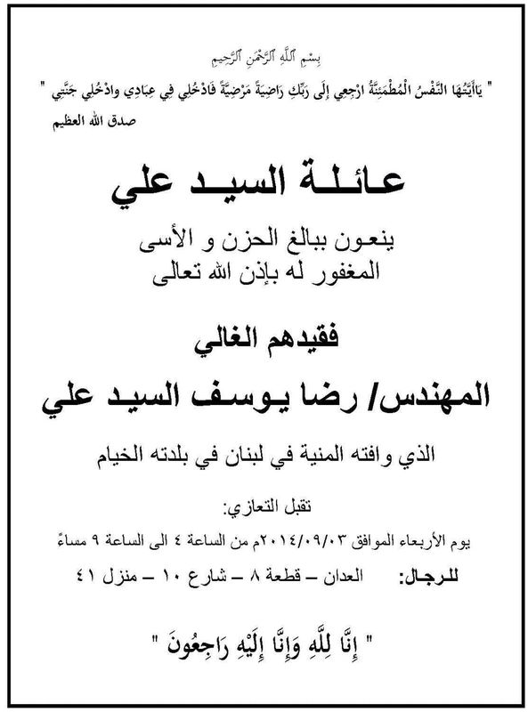 سجل التعازي بالمرحوم المهندس رضا يوسف السيد علي