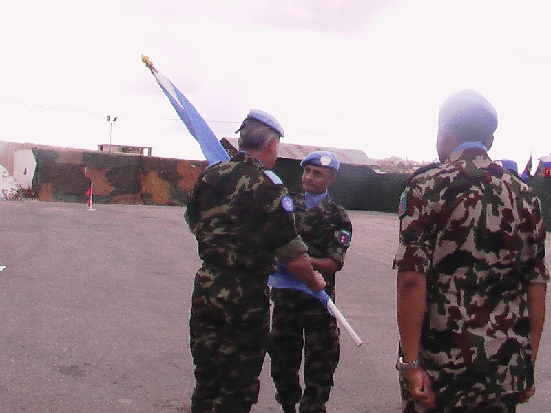 ومن ثم سلّم قائد الكتيبة النيبالية المغادر المقدم سوشيل كومار كاركي Lt.Col.Sushil Kumar Karki ، علم الامم المتحدة الى الجنرال شابا الذي سلمه بدوره الى خلفه قائد الكتيبة النيبالية الجديد المقدم راجندرا ماني جيري Lt.Col.Rajendra Mani Giri،إيذاناً بتسلمه مهامه في قيادة الكتيبة الدولية في إطار "اليونيفيل" في القطاع الشرقي من المنطقة الحدودية.