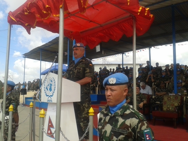 أكد القائد العام لليونيفيل الجنرال لوتشيانو بورتولانو ممثلا بقائد القطاع الشرقي الجنرال اندريس شابا، على التزام اليونيفيل بما فيها الكتيبة النيبالية على تطبيق القرار 1701 من اجل الحفاظ على الامن والاستقرار في جنوب لبنان، مشيرا الى ان الكتيبة النيبالية أظهرت تفان خلال مهمّات حفظ السّلام التابعة للأمم المتّحدة، واحترافا مستمرا لتعاونها مع الجيش اللبناني في القيام بدوريّات على الخط الأزرق وفي منطقة عملها. كما حافظت على وتيرة قويّة من تقديم الحماية لفرق نزع الألغام.