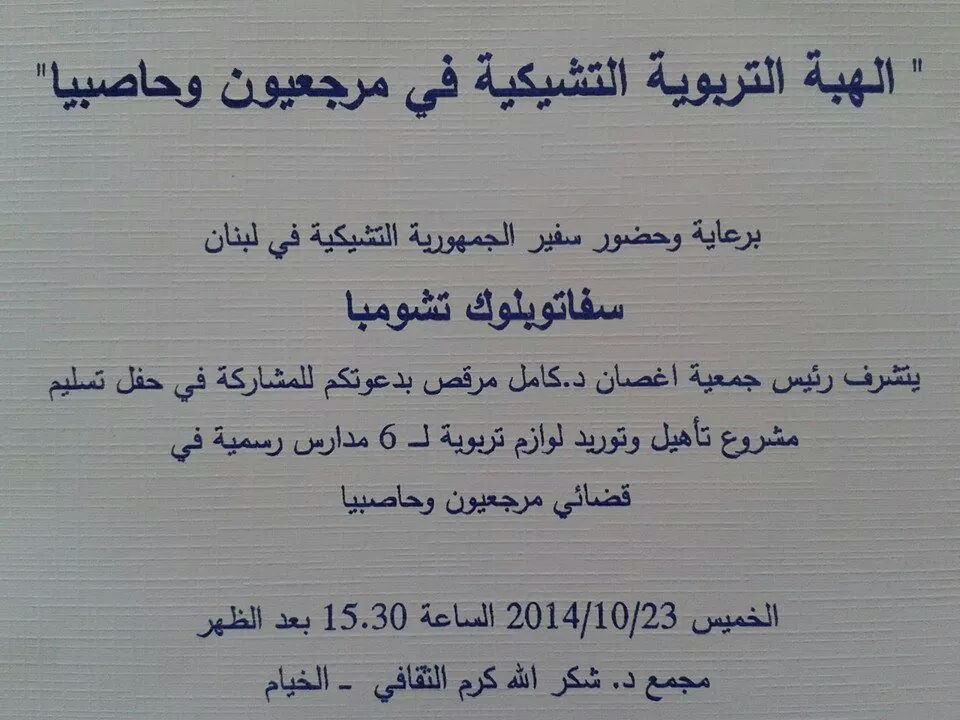 برعاية وحضور سفير الجمهورية التشيكية في لبنان "سفاتوبلوك تشومبا" دعا رئيس جمعية أغصان "د.كامل مرقص" للمشاركة في حفل تسليم مشروع تأهيل وتوريد لوازم تربوية ل 6 مدارس رسمية في قضائي مرجعيون وحاصبيا.