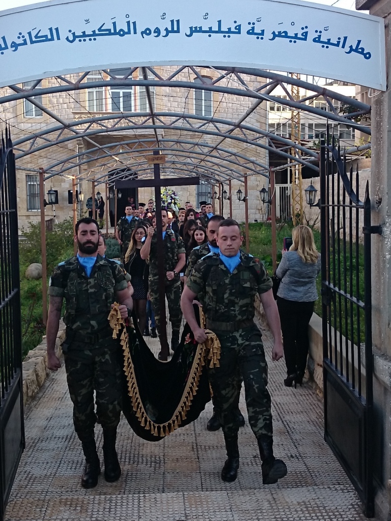 وحمل الجنود الاسبان النعش المزين بالورود تتقدمهم حاملات الطيب وراعي ابرشية بانياس ومرجعيون للروم الملكيين الكاثوليك المتروبوليت جاورجيوس حداد من مقر المطرانية الى الكنيسة حيث اقيمت رتبة دفن السيد المسيح.