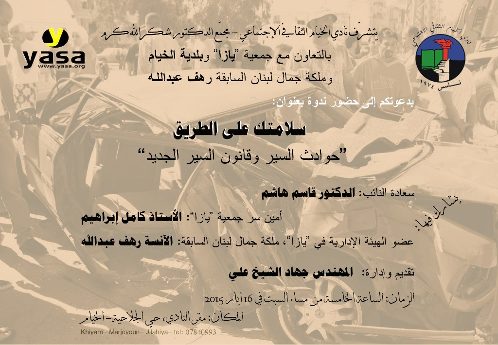 انطلاقاً من أهدافه الرامية إلى المساهمة في نشر الثقافة والتوعية الإجتماعية يقيم "نادي الخيام الثقافي الإجتماعي" –مجمَّع الدكتور شكرالله كرم لقاء مع جمعية "اليازا" اللبنانية موضوعه حوادث السير- أسباب ووقاية- مع شرح لقانون السَّير الجديد.