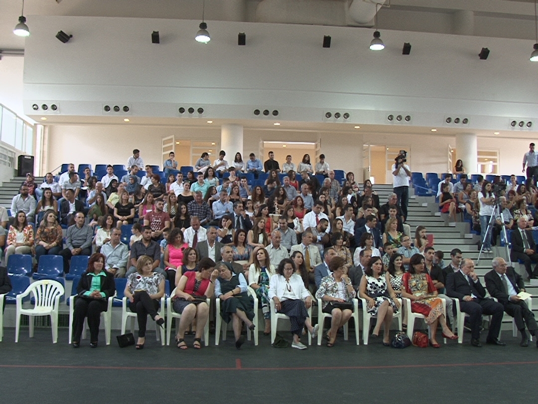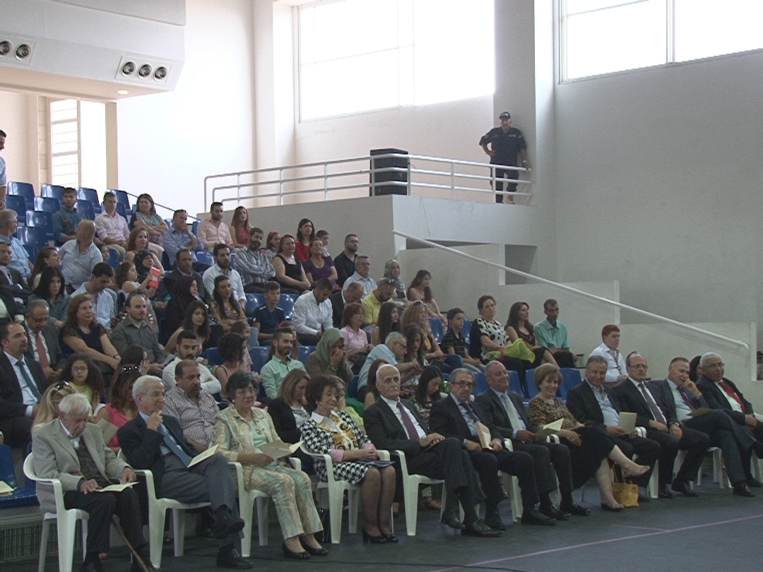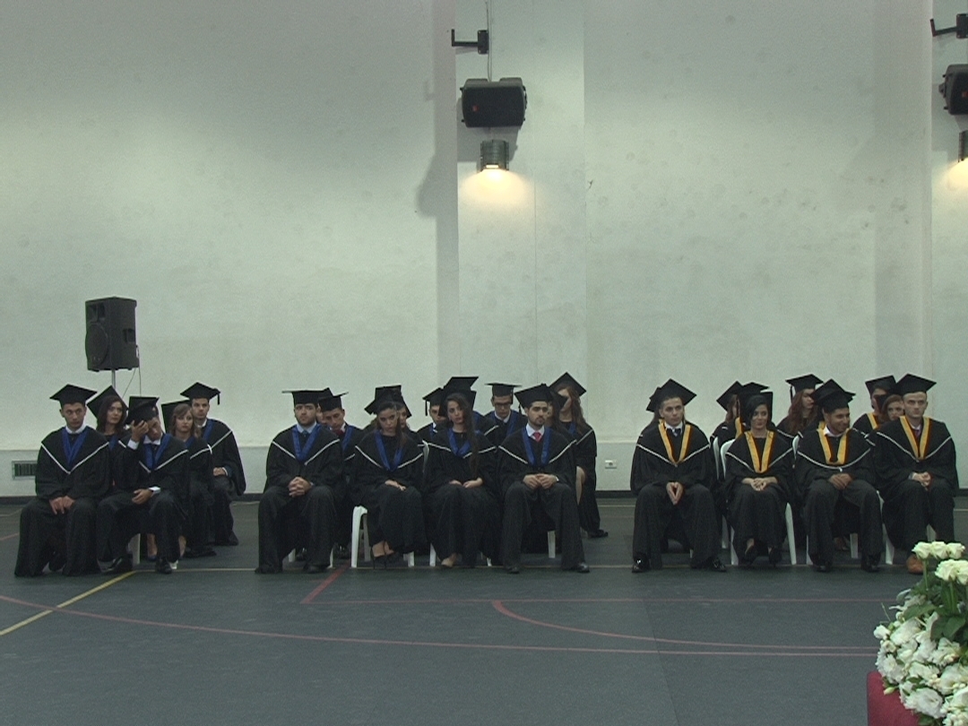 بداية الاحتفال دخول موكب الخريجين باللباس التقليدي ثم النشيد الوطني، وكلمة ترحيب للمربي سمير عقل، وكلمة باسم الطلاب المتخرجين.