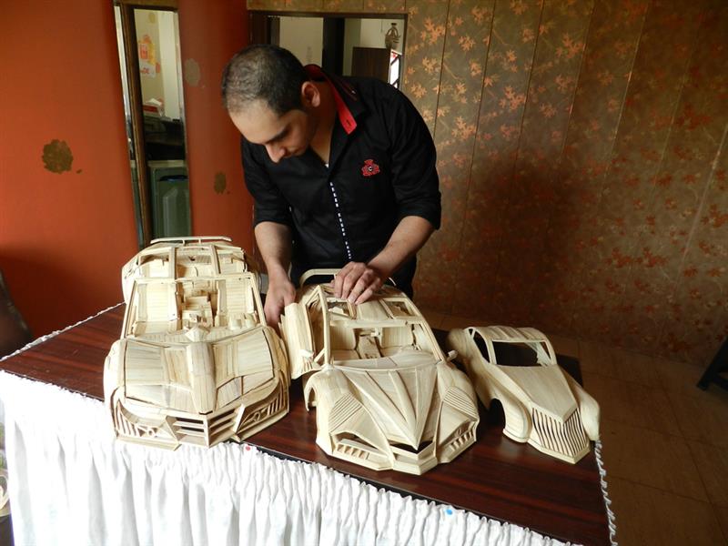 أول مجسم لسياراته أطلقه في العام 2009، ليصل عدد المجسمات الجاهزة إلى تسعة، مستعملا في تحضيرها وجمعها، الكرتون المقوى وألواح خشبية، ومواد لاصقة، مستعينا بمعدات تقليدية معروفة مثل "مقص الشحالة، منشار صغير، متر ،ورق برداغ، قطاعة، ريش المثقاب، شفرات حادة، "ويتم لصق قطع الخشب بعضه ببعض باستخدام مادة خاصة تعرف باسم super glue.