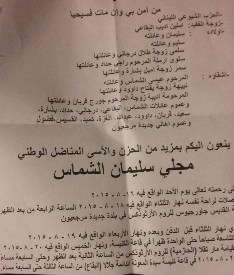 شيع، عصر اليوم، اهالي مرجعيون والحزب الشيوعي اللبناني المناضل مجلي سليمان الشماس،وهو من الرعيل الاول الذي انتسب للحزب الشيوعي في الاربعينيات في فلسطين، وعاد الى بلدته بعد نكبة فلسطين 1948 ليساهم في تأسيس وتطوير الحزب في مرجعيون وحاصبيا.