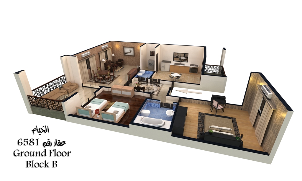 كل طابق في المبنى الكبير يحتوي على شقتين سكنيتين، مساحة كل منهما 170 مترا مربعا تتكون كل منهما من 3 غرف نوم وصالون كبير و3 حمامات (حمام رئيس في غرفة النوم الرئيسية).