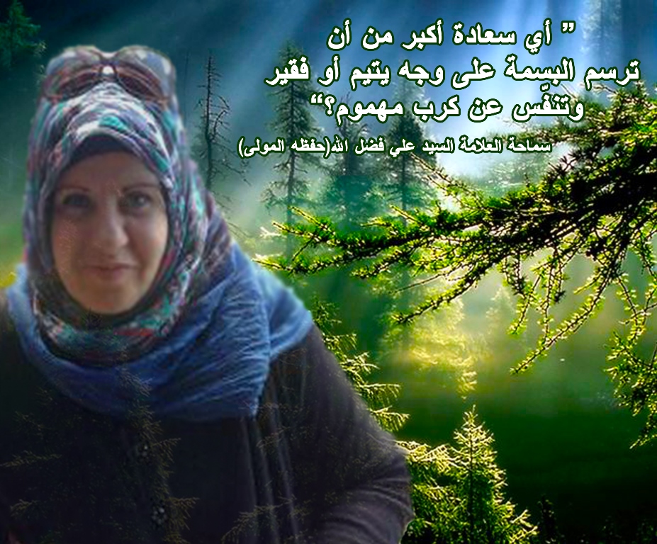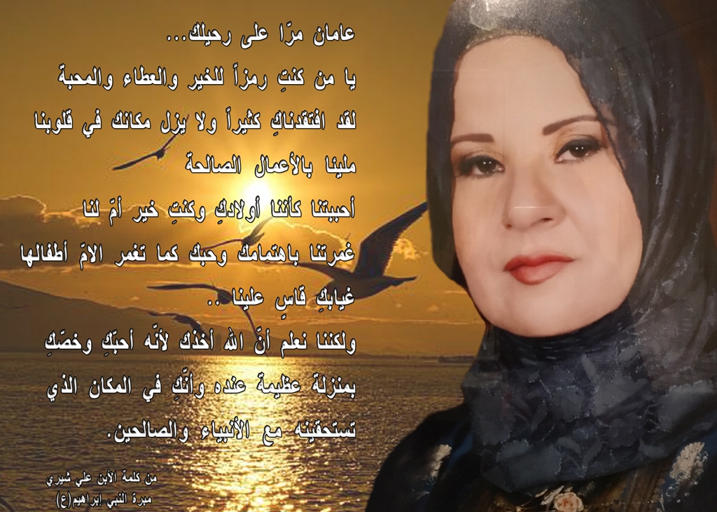 رحمك الله يا أمّنا الفاضلة وأسكنك الله فسيح جنانه يا من كنت أملنا ورجاءنا ... من بعد الله عزّ وجلّ. رحمك الله يا خير الأهل، يا أعزّ الامّهات ويا أكرم المؤمنات، رحمك الله يا من عملت بقول مولانا الإمام زين العابدين(ع) " من سعى وأعان مؤمناً مسلماً محتاجاً حتّى كفاه الله حاجته أو يجعل الله له مخرجاً كفاه الله حساب الآخرة وأسكنه الجنّة في درجات العلى"