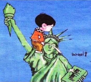يُظهر رسم كاريكاتوري نُشر مؤخرا في احدى الصحف الاميركية، عضوا في الكونغرس الاميركي، يقول مستشهدا بتصريح لبوش أثناء الحملة الانتخابية بأنه <<سيغير الأجواء في واشنطن>>: <<لم أعتقد أنه كان يقصد تغيير الأجواء في العالم بأكمله..>>.