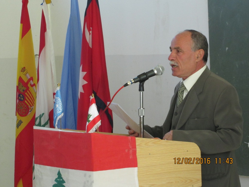 بداية النشيد الوطني وأناشيد الامم المتحدة اسبانيا والنيبال، ثم القى جواد كلمة شكر فيها "اليونيفيل" على المشروع، وقال: "هذا المشروع الذي فيه مصلحة المدرسة وتلامذتها هو لبنة في بناء الوطن ضمن مهمة الأمن والمحافظة على السلام الذي هو هدفنا الاساسي والمفتاح لحياة كريمة ينعم بها أبناؤنا بفضل جهودكم وتفانيكم، خصوصا أنكم تركتم أهلكم ومن تحبون لمشاركتنا العمل البناء والتخفيف عنا".