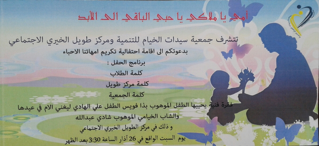 دعت جمعية مركز محمد طويل الخيري الاجتماعي وجمعية سيدات الخيام للتنمية للمشاركة بالاحتفال بعيد الام.