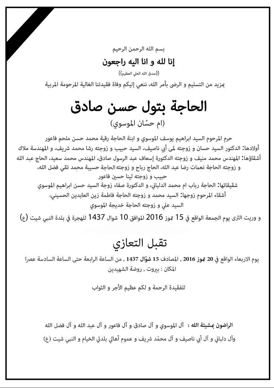 سجل التعازي بالمربية المرحومة الحاجة بتول حسن صادق (ام حسان الموسوي)