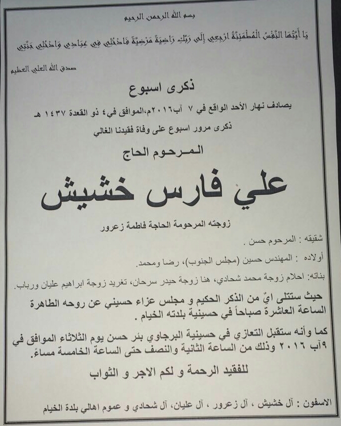 تصادف نهار الاحد الواقع فيه 7 آب 2016 ذكرى مرور أسبوع على وفاة المرحوم الحاج علي فارس خشيش (أبو علي) والمرحومة الحاجه فوزية أمين خشيش.