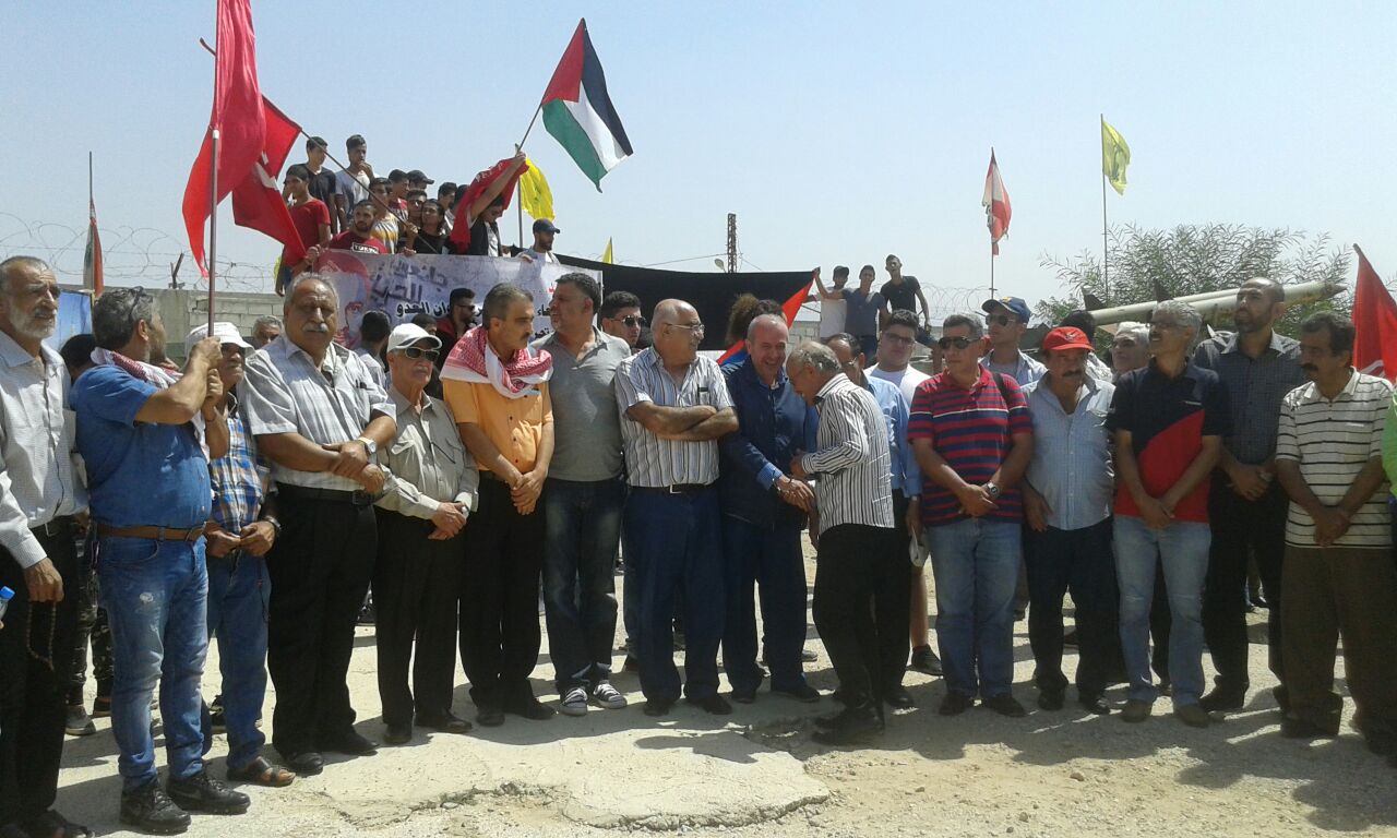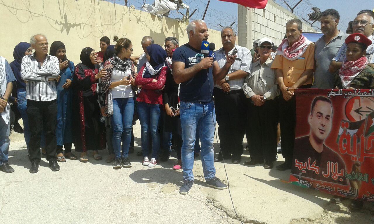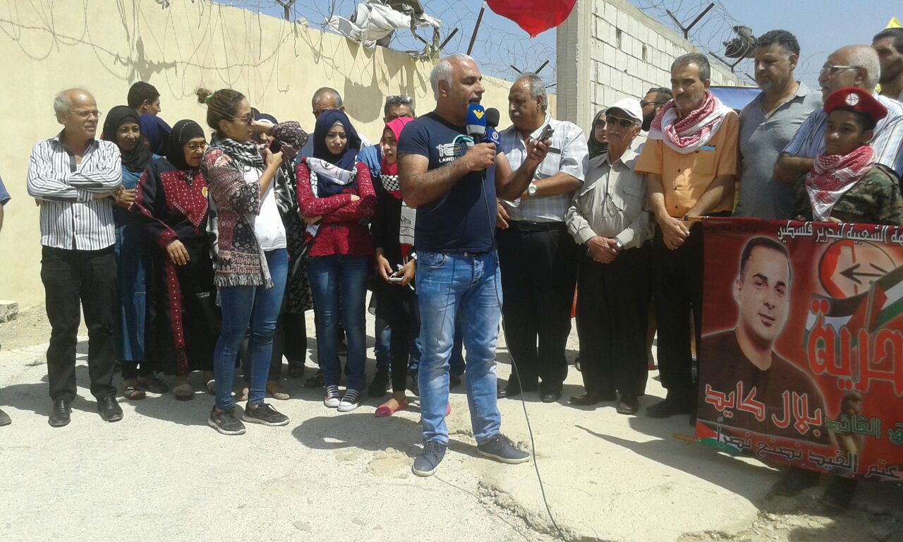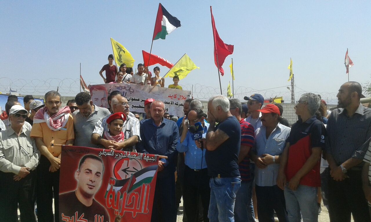 كلمة الجبهة الشعبية لتحرير فلسطين ألقاها أبو جابر، مسؤول العلاقات السياسية للجبهة الشعبية لتحرير فلسطين في لبنان، الذي بدأها بتوجيه التحية والفخر للمقاومة في انتصارها على المحتل الصهيوني وطرده مرغماً من لبنان جنوبه الصامد وكما وجه أبو جابر في كلمته التحية والتقدير والاعتزار للقائد بلال كايد على صموده وإصراره على مقاومة سجانيه، وإدارة وسلطة السجون الصهيونية، لنيله الحرية وكان ما أراد لبلال أنه نال حريته على أمل أن يفرج عنه قريباً، ليكون بين رفاقه وأهله ومحبيه وشعبه، ليمارس عمله الجهادي والمقاوم من جديد حتى تحقيق أهدافه وأهداف الشعب الفلسطيني بتحرير فلسطين وتحرير المعتقلين والأسرى من سجون ومعتقلات الكيان الصهيوني الغاصب. وأضاف أبو جابر نحن هنا لنحيي ذكرى استشهاد أبو علي مصطفى الذي عاد إلى أرض فلسطين ليناضل جنباً إلى جنب مع رفاقه مرددا مقوله أبو علي مصطفى عدنا إلى أرض الوطن لنقاوم ولن نساوم، واستشهد أبو علي على أرض فلسطين ليفتح الطريق أمام انتفاضة جديدة للشعب الفلسطيني امتدت على كل أرض فلسطين، مؤكداً من خلال استشهاده أننا جبهة عصية على الكسر والخنوع، وجاء انتخاب سعدات أميناً عاماً للجبهة، وتمت عملية اغتيال رحبعام زئيفي، ليؤكد للعالم أجمع بأننا جبهة الحكيم، وأبو علي مصطفى، وأحمد سعدات، وغسان كنفاني، وأبو ماهر اليماني، جبهة الشهداء، والجرحى، والمعتقلين، والأسرى، جبهة قدمت قافلة طويلة وكبيرة من الشهداء وخيرة قادتها بأنها جبهة لن تركع ولن تستكين ولن تساوم عن ذرة تراب من أرض فلسطين جبهة ستبقى متمسكة بالمقاومة والنضال حتى تحقيق أهداف شعبنا الفلسطيني في الحرية والاستقلال والعودة وتحرير كل الأسرى من معتقلات وسجون الاحتلال الصهيوني. وفي ختام كلمته وجه أبو جابر التحية للشهداء، والمعتقلين، والأسرى، وللمقاومين على أرض لبنان وفلسطين، كما أشار في كلمته كلمته إلى التمسك بأمن واستقرار لبنان، ولن نكون مع طرف ضد طرف آخر، كما طالب أبو جابر الدولة اللبنانية بالنظر إلى وضع الفلسطينين في لبنان ومعاملتهم معاملة تليق بهم، وإعطائهم حقوقهم المدنية والاجتماعية إلى حين عودتهم إلى فلسطين، وأكد رفض الشعب الفلسطيني بكل فئاته التوطين والتهجير.وفي ختام الوقفة التضامنية وجه فتحي أبو علي للحضور، والمشاركين، ووسائل الإعلام، والفضائيات، ولجنة الأسرى، والمعتقلين في سجون الاحتلال الصهيوني، وللقيمين على معتقل الخيام لإتاحتهم الفرصة للقاء والتضامن هنا مع بلال كايد، وإحياء لذكرى استشهاد أبي علي مصطفى، معاهدهم على الاستمرار في نهج المقاومة والمقاومين.