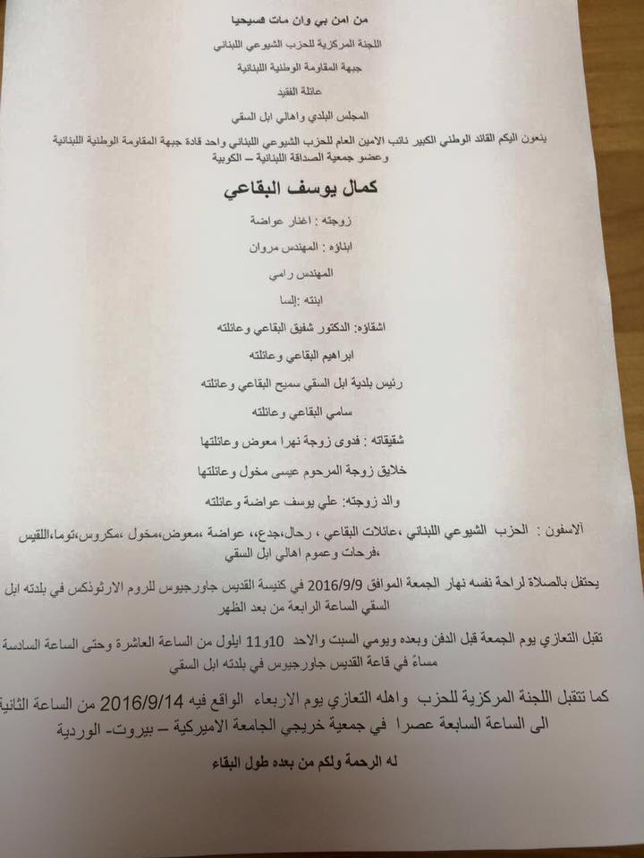 سيوارى جثمان الحبيب كمال البقاعي الثرى يوم الجمعة في قريته الجنوبية "إبل السقي".