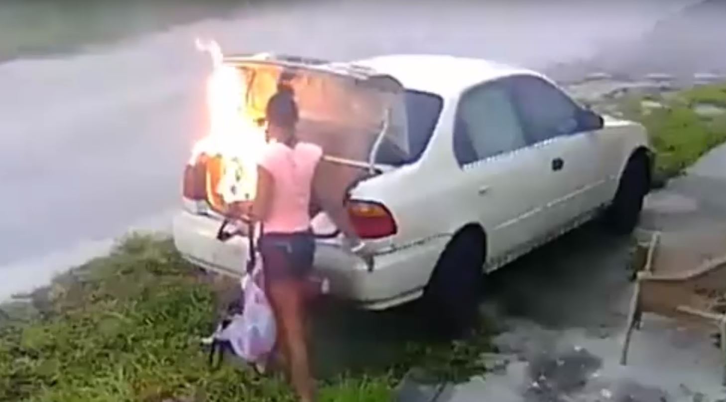 أظهر مقطع فيديو نشر على موقع يوتيوب الإلكتروني لحظة إضرام امرأة النار بسيارة ظنت بأنها سيارة حبيبها السابق انتقاماً منه لتكتشف فيما بعد بأنها أخطأت الهدف.