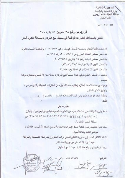 لقد وافق المجلس البلدي السابق (2010 ـ 2016) برئاسة المهندس عباس عواضة، في «جلسته المنعقدة بتاريخ 19 آذار 2016، المكتملة النصاب قانوناً، على استملاك 20 متراً من محيط نبعالدردارة». وكلف رئيس البلدية «اتخاذ الإجراءات اللازمة لوضع هذا القرار موضع التنفيذ وفقاً للأصول». واشار القرار إلى «أننا تقدّمنا في وقت سابق عبر قرار (م. ب.) بطلب استملاك 10 أمتار من محيط نبع الدردارة. وبناء على موافقة المديرية العامة للموارد المائية والكهربائية في وزارة الطاقة على مشروع الاستملاك موافقة مشروطة باستملاك البلدية لما يزيد عن 20 متراً من محيط النبع، بحيث تكون من ضمنه منطقة الحرم التي تحفظ البيئة سليمة من التلوث، وهو ما يخدم المصلحة العامة. وحيث إن المجلس البلدي يُولي عناية خاصة لنبع الدردارة يجعله متنزهاً للعموم باعتباره موقعاً سياحياً».
