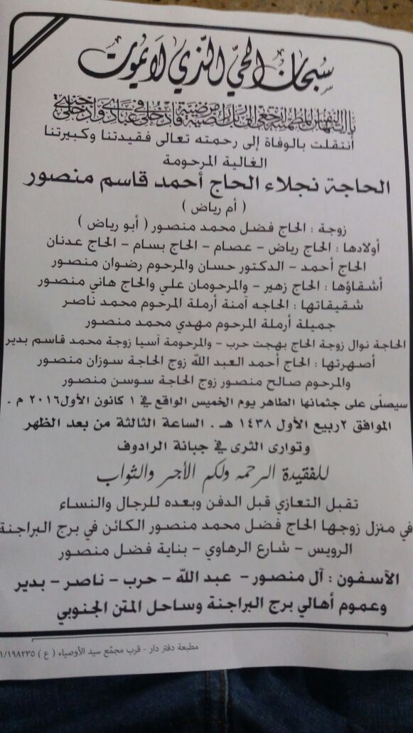 انتقلت إلى رحمته تعالى الحاجة نجلاء الحاج أحمد قاسم منصور (أم رياض)