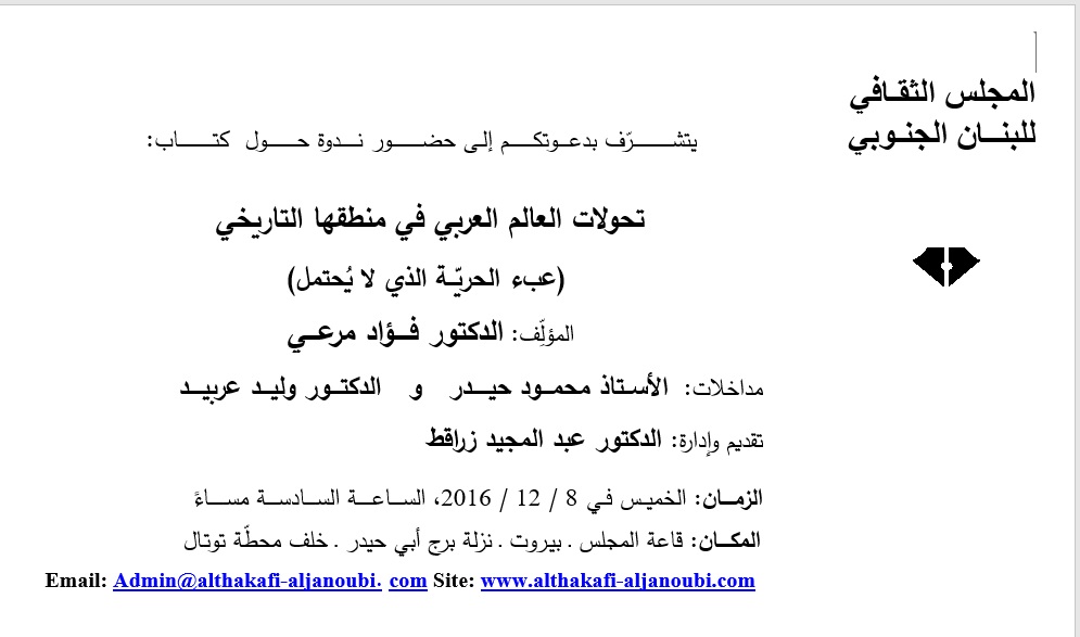 دعا المجلس الثقـافي للبنان الجنوبي إلى حضور ندوة حول كتاب:
