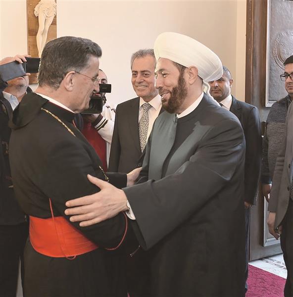 البطريرك الراعي خلال ترحيبه بمفتي سوريا أحمد بدر الدين حسون في بكركي بحضور السفير السوري علي عبد الكريم علي