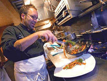 حينما ذهبت إلى المطعم بصحبة زوجتي بدأنا الأكل بطبق من فاكهة الخوخ المشوي واسم الوجبة «BLOSSOM BLUFF» (11 دولارا) وهي وجبة حلوة المذاق ودافئة ويتوازن معها طعم أوراق الخس المعروفة باسم «اروغولا» مع بقلة الماء وجبنة الـ «ماسكربون» الايطالية المعروفة بقشدتها ومع عسل زهور المريمية. وتحت يد رئيسة الطهاة آني سومرفيل مزرعة عضوية (اورغانيك) يديرها مركز شينتو. لكن بعض الوجبات غير مضبوطة تماما. فوجبة رافيولي ريكوتا السبانخ (23 دولارا) لها ذائقة أرضية وثومية لكنها غير مركزة –الصلصة فوق الباستا نصف الناضجة. أما أسياخ المسكيت المشوي (19 دولارا) فهي غير مستقيمة. والذرة مطبوخة بشكل تام لكن القرع الصيفي غير ناضج. مع ذلك فهو لذيذ، مع التشارمولا الحادة وغنية بالتوفي وتقدم فوق الكسكسي بالفستق والكرز الجاف.