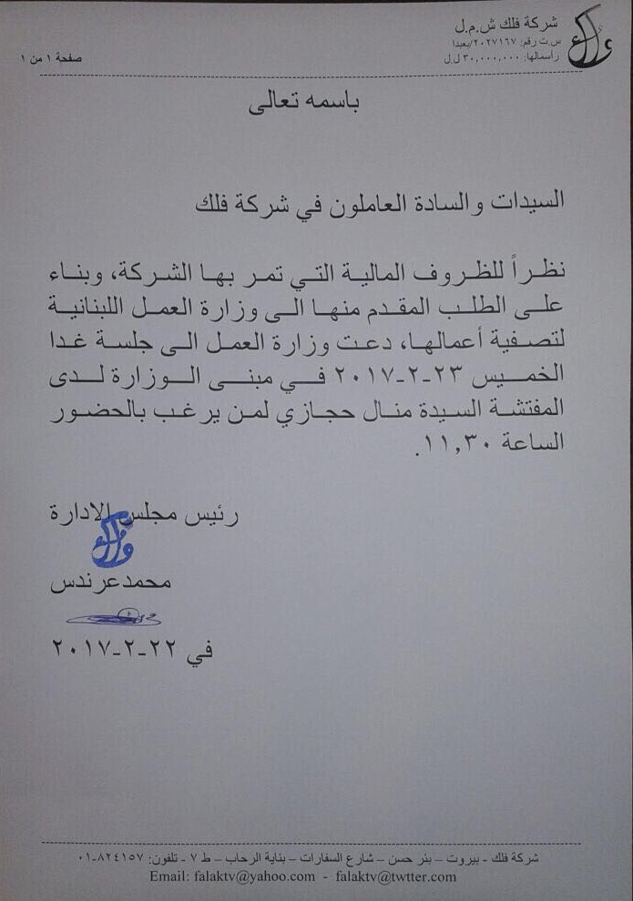 وتسعى الشركة اليوم لتصفية وضع موظفيها عبر دفع تعويضات لهم بموجب عقودهم مع شركة "فلك"، أي أن الموظف المسجل منذ 4 سنوات أي منذ تأسيس الشركة، سيحصل على 4 رواتب بحسب الحد الأدنى الأجور، علماً أن معظم هؤلاء يعمل في القناة منذ أكثر من عشر سنوات، ورواتبهم أعلى من ذلك بكثير.