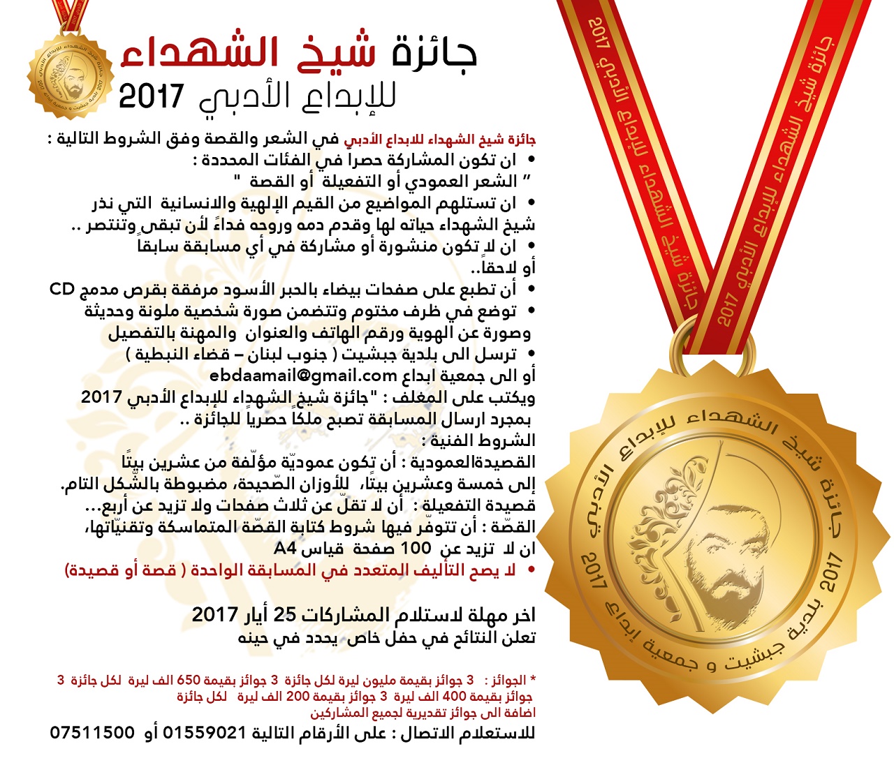 جائزة شيخ الشهداء للابداع الأدبي في الشعر والقصة وفق الشروط التالية :
