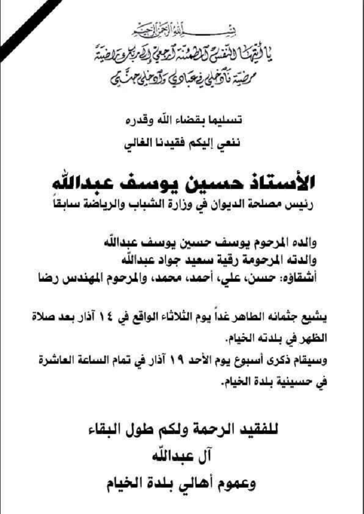 سجل التعازي بالمربّي المرحوم حسين يوسف حسين عبدالله