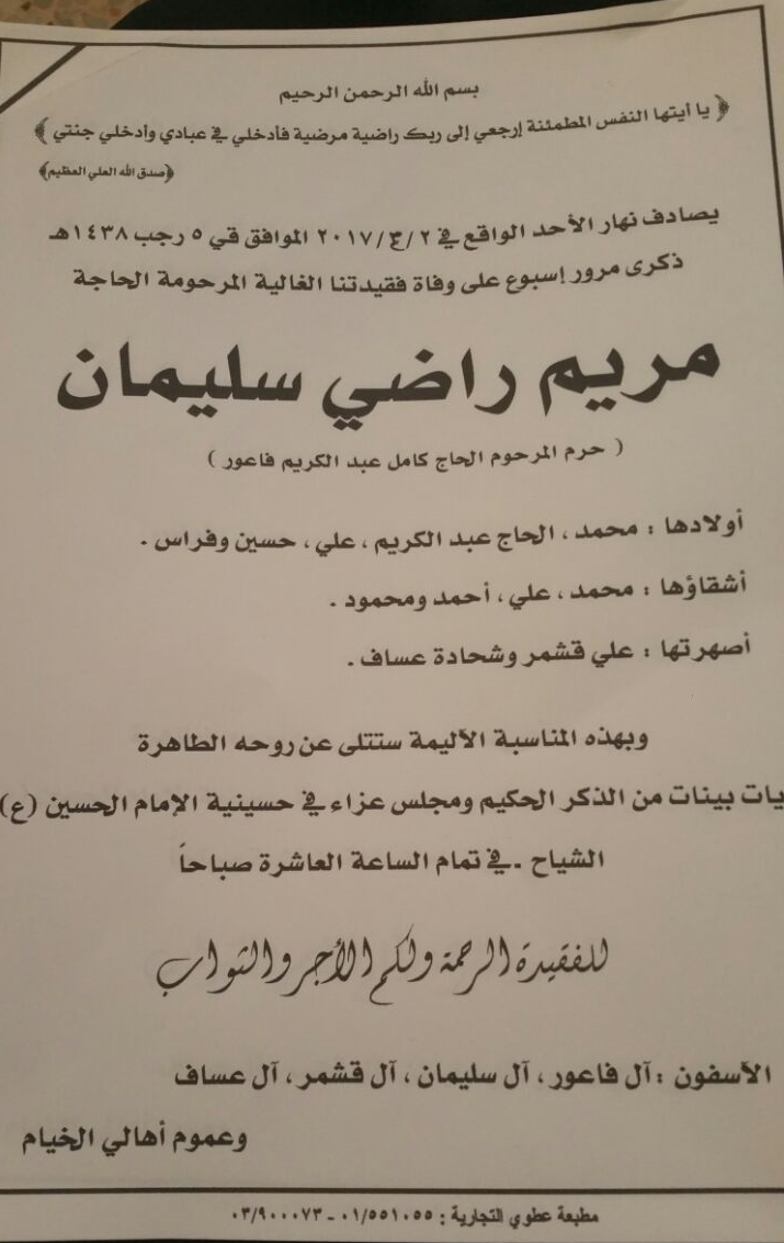 يصادف نهار الاحد الواقع في 2 نيسان 2017 ذكرى مرور أسبوع على وفاة المرحومة الحاجه مريم راضي سليمان (أم محمد فاعور)