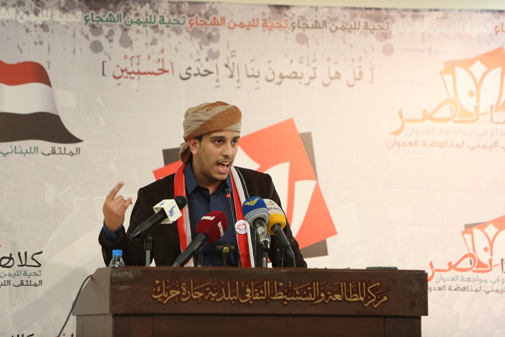 كلمة الملتقى اللبناني القاها رئيس جمعية ابداع الشاعر علي عباس الذي أكد على المبادىء الانسانية للشعب اللبناني المقاوم التي انطلق باكراً لمواجهة العدوان في لبنان وأدان العدوان الغاشم على اليمن . وقال: ان وقوفنا مع اليمن الشقيق نابع من الشعور بالمسؤولية الوطنية والقومية وختم بقصيدة جاء فيها : هنا مستودع الأسرار .. وصفوة الأنصار ..ولا عجب .. من دونها .. لا رجال .. ولا نزال .. ولا قتال ولا عرب! هنا مقبرة الغزاة .. هنا كعبة الأباة . .هنا الضاحية .. هنا اليمن .