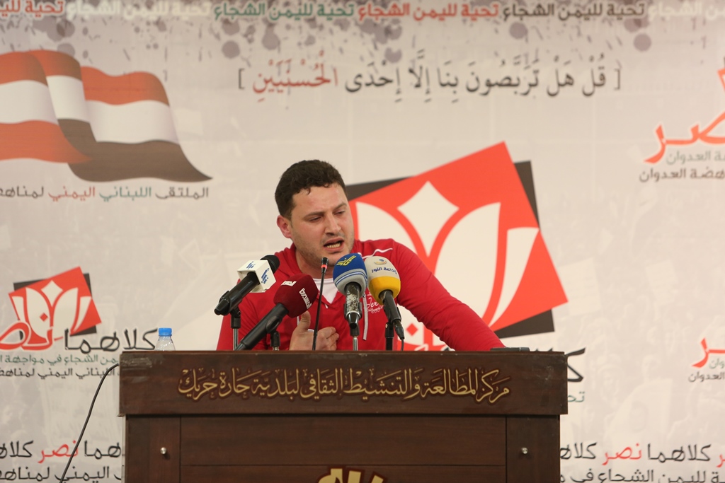 بعد تلاوة من القرآن الكريم والنشيدين اللبناني واليمني وتقديم من الاعلامي اليمني عبد السلام حجان القى كلمة الماتقى اليمني علي المحطوري الذي شرح ابعاد العدوان الجائر على الشعب اليمني . وقال في العام الثاني نتطلع الى مزيد من الانتصارات ووجه التحية الى الشعب اللبناني المقاوم والى سيد الوفاء .
