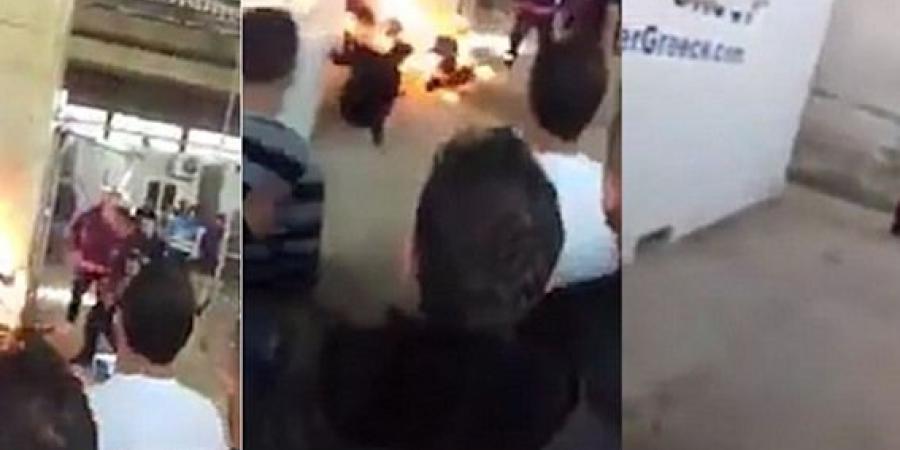 وأصيب عنصر الأمن الذي حاول منع اللاجئ من إحراق نفسه، بحروق في يديه ووجهه.