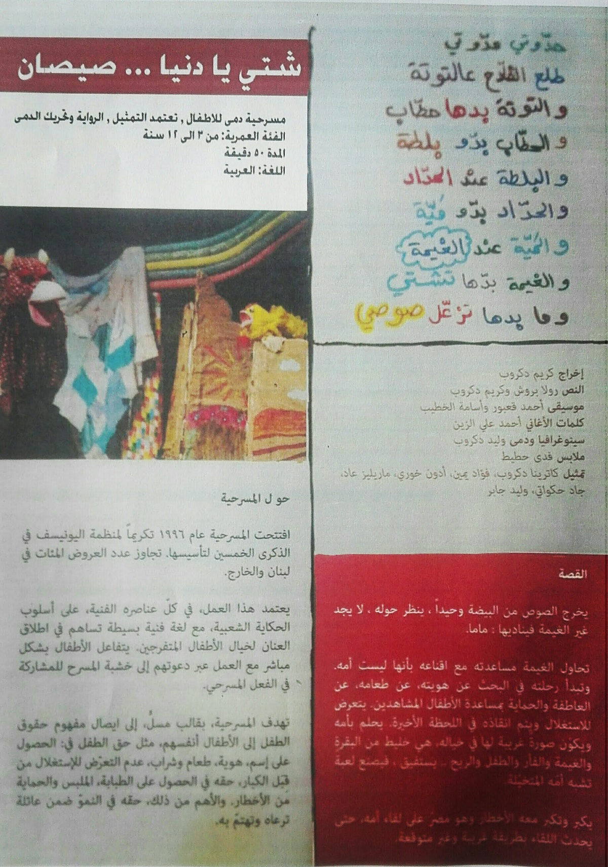 بمناسبة عيد الطفل، دعت چمعية سيدات الخيام للتنمية لحضور مسرحية بعنوان شتي يا دنيا صيصان من مسرح الدمى اللبناني بالتعاون مع مؤسسة الرؤية العالمية ونادي الخيام الثقافي الإجتماعي.