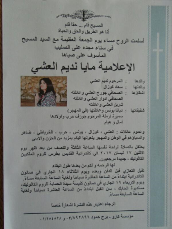 أحرّ التعازي لعائلة مايا وللجسم الإعلامي في المنطقة.. نشاركهم الحزن والأسى بفقدان الزميلة العزيزة مايا.