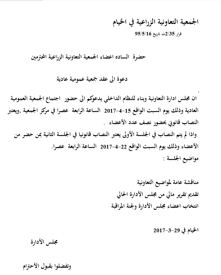 بناء للنظام الداخلي للجمعية التعاونية الزراعية في الخيام، دعا مجلس ادارة الجمعية "الهيئة العامة" الى حضور جلسة للجمعية العمومية العادية (هي الدعوة الثانية) وذلك يوم السبت الواقع 22-4-2017 الساعة الرابعة عصرا.