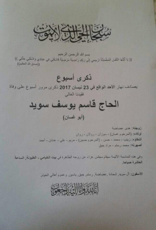 يصادف نهار الأحد الواقع فيه 23 نيسان 2017 ذكرى مرور أسبوع على وفاة فقيدنا الغالي