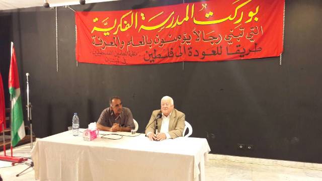 في الذكرى التاسعة والستين للنكبة، وتضامنا مع الحركة الأسيرة في معركة الأمعاء الخاوية، أقامت الجبهة الشعبية لتحرير فلسطين، ومنظمة المعلمين الفلسطينيين، في منطقة صيدا لقاء مع المناضل الوطني والقومي الأستاذ غالب بو مصلح، تحت عنوان" العولمة وتغييرات النظامين العالمي والإقليمي، وانعكاسها على القضية الفلسطينية، السبت 20/5/2017، في مركز معروف سعد الثقافي في صيدا. حضر اللقاء فصائل العمل الوطني اللبناني والفلسطيني، واللجان الشعبية، وقيادة الجبهة الشعبية في منطقة صيدا وكوادرها، وشخصيات تربوية، واجتماعية ووطنية افتتح الدكتور طلال أبو جاموس اللقاء بترحيب بالحضور،ومن ثم بالنشيدين الوطنيين اللبناني والفلسطيني، مشيرًا إلى أن الجبهة الشعبية، ومنذ انطلاقتها كان شعارها الفكر يوجه البندقية، لأن الفكرهو طريق أساسي في تغييرالعقول والنفوس.
