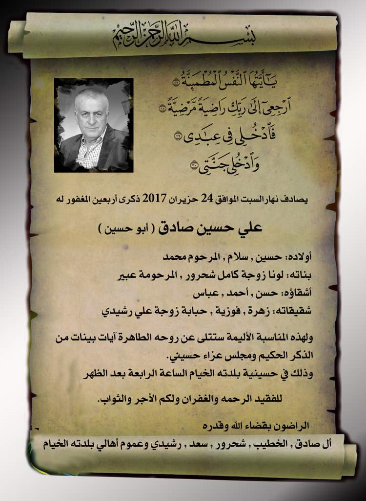بهذه المناسبة الأليمة ستتلى آي من الذكر الحكيم ومجلس عزاء عن أرواحهم الطاهرة في حسينية بلدتنا الخيام في تمام الساعة الرابعة عصراً.