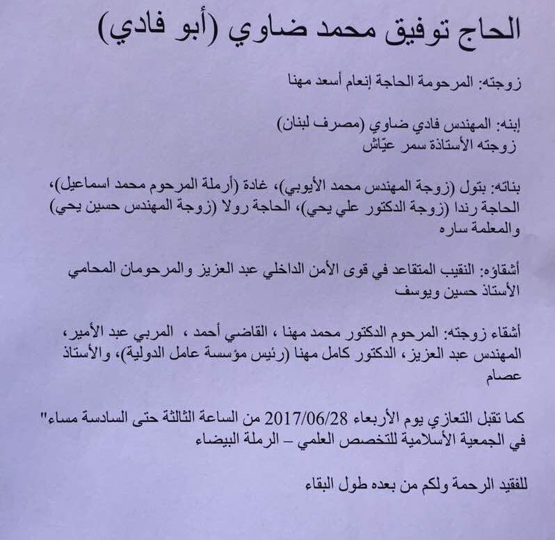 تتقبل عائلة المرحوم التعازي في بيروت نهار الأربعاء 28 حزيران 2017 في الجمعية الإسلامية للتخصص والتوجيه العلمي، الكائنة في محلة السبينس قرب "مركز أمن الدولة"، من الساعة الثالثة بعد الظهر لغاية السادسة عصراً.