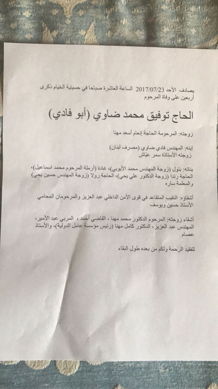 يصادف نهار الاحد الواقع فيه 23 تمّوز 2017 ذكرى أربعين المرحوم الحاج أبو فادي توفيق محمد ضاوي